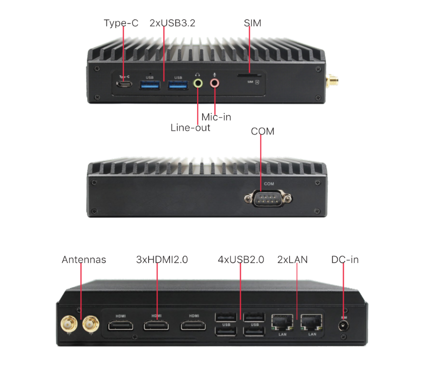 I/O Ports: 2xLAN, 1xCOM, 2xUSB3.2, 4xUSB2.0, Type-C, SIM